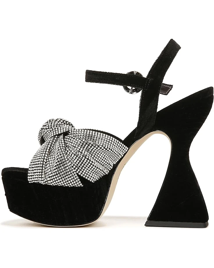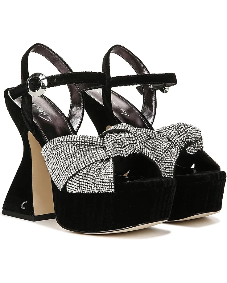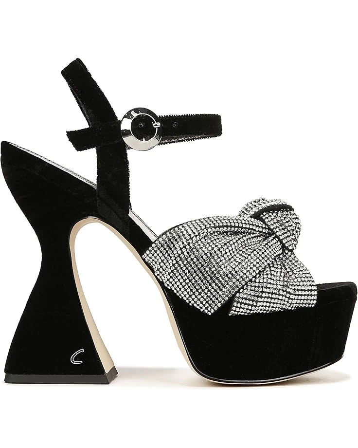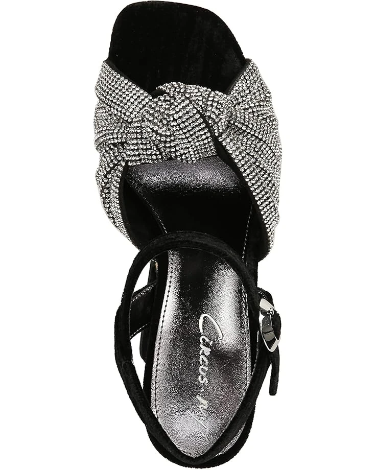 - Featuring an adjustable ankle strap with buckle closure, Circus by Sam Edelman® Audrea Jewel. This pair of heels comes with open square toe design and a knotted strap with rhinestone detailing on the front. It has a plisse velvet jeweled upper, and synthetic lining.