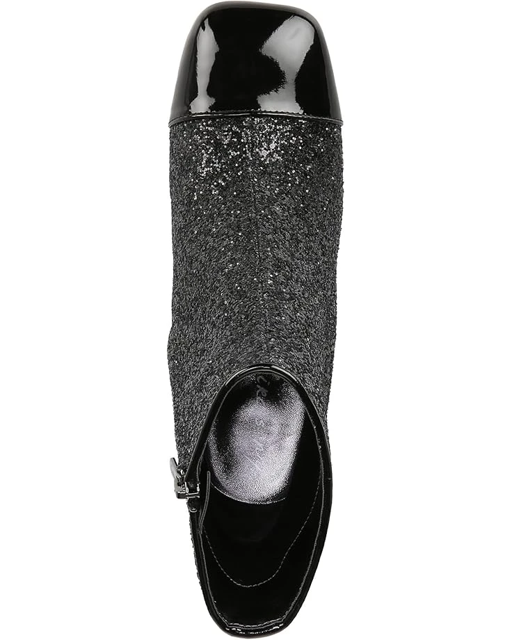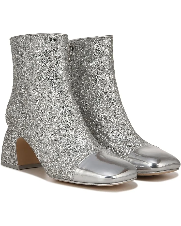 I was skeptical of the glitter on this bootie, but so pleasantly surprised. The glitter is pretty well embedded or glued on, and I haven’t noticed any fall out. The booties are lightweight, and the beautiful mirrored toe box is so shiny! The toe box itself is roomy enough where I can wear a thin sock just fine. The shaft height is perfect for ankle jeans, pants, leggings, tights, etc. and I cannot wait to wear these in fall with a faux leather skirt. I got these in an 8.5 and am typically a size 38.5 to 39 euro, so I opted for the 8.5. I was so glad I did because these are true to size, if slightly small. The block heel is wonderfuleasy to walk in and gives me a nice lift. Width wise these are true to size. The zipper is nice and sturdy. These feel comfortable on and very stable, and feel well made. The shape of the booties are so cool, and architectural that they look so special. Each bootie comes in its own storage bag, which I really appreciate as I imagine the glitter textile upper should be protected. These booties make me smile and I just love them. These are an attention grabber for sure!