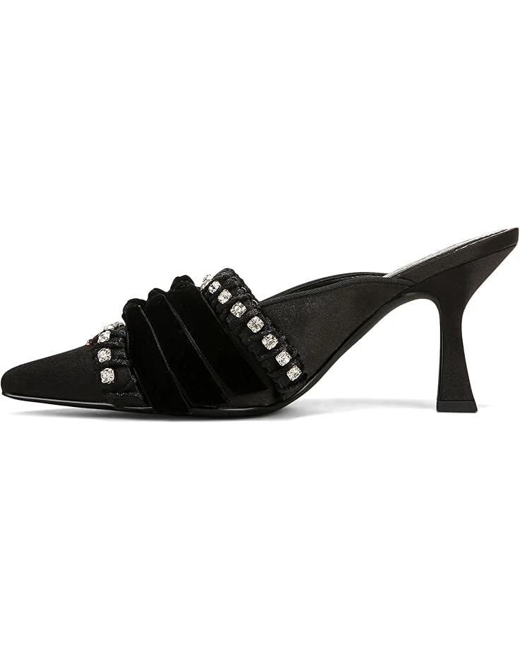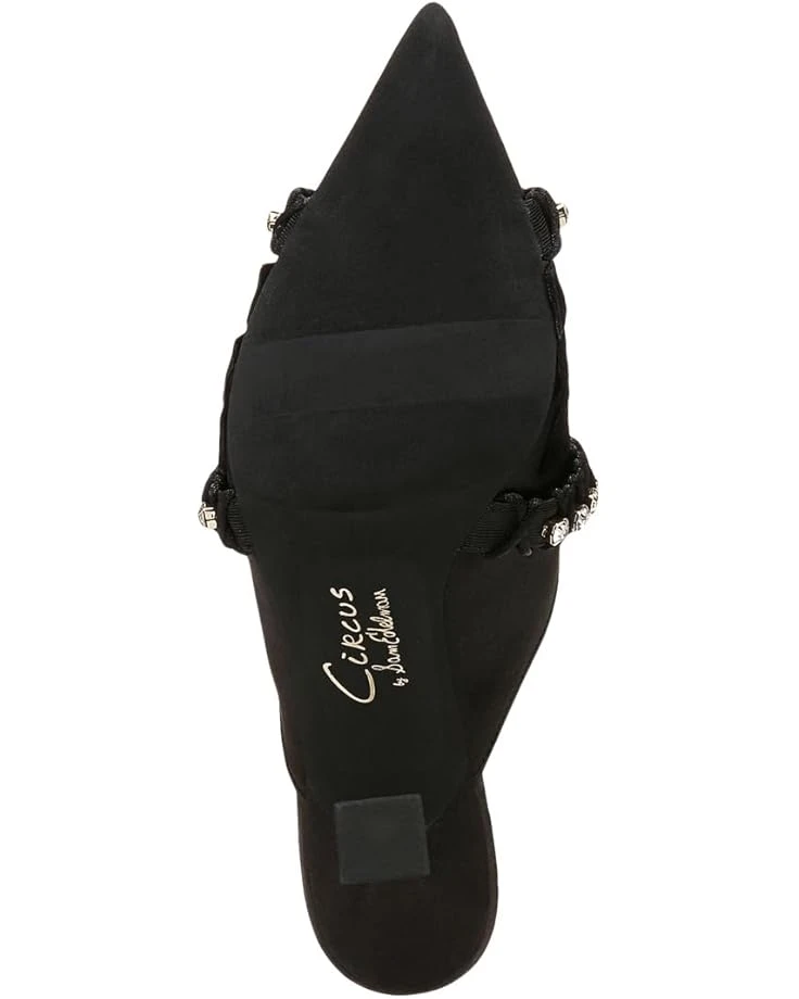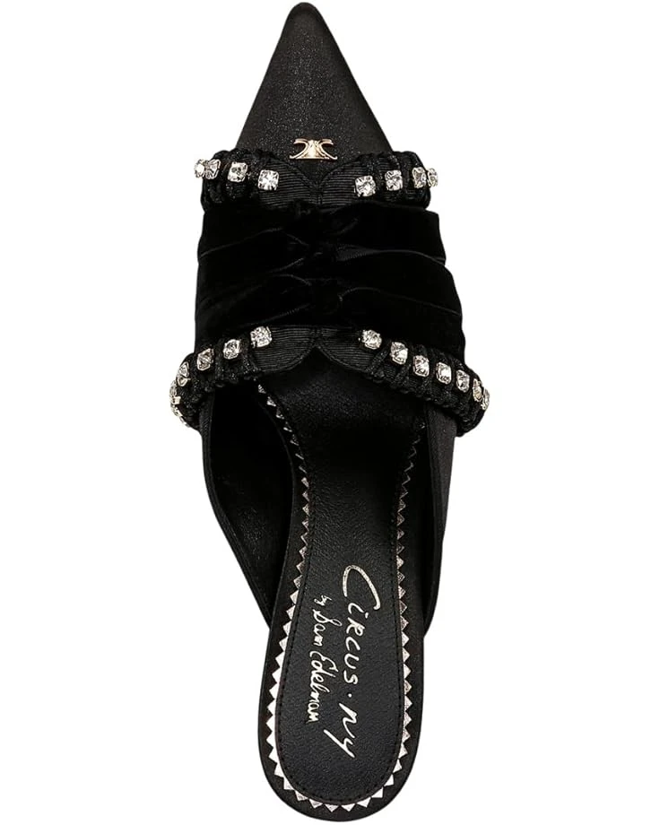 - With a crystal trim and ribbon ties, Tristyn embodies the best part of the cold weather seasons-rich textures and awesome indulgences. Featuring a fabric upper, synthetic lining and insole, pointed toe silhouette in a slip-on style and flared heel.