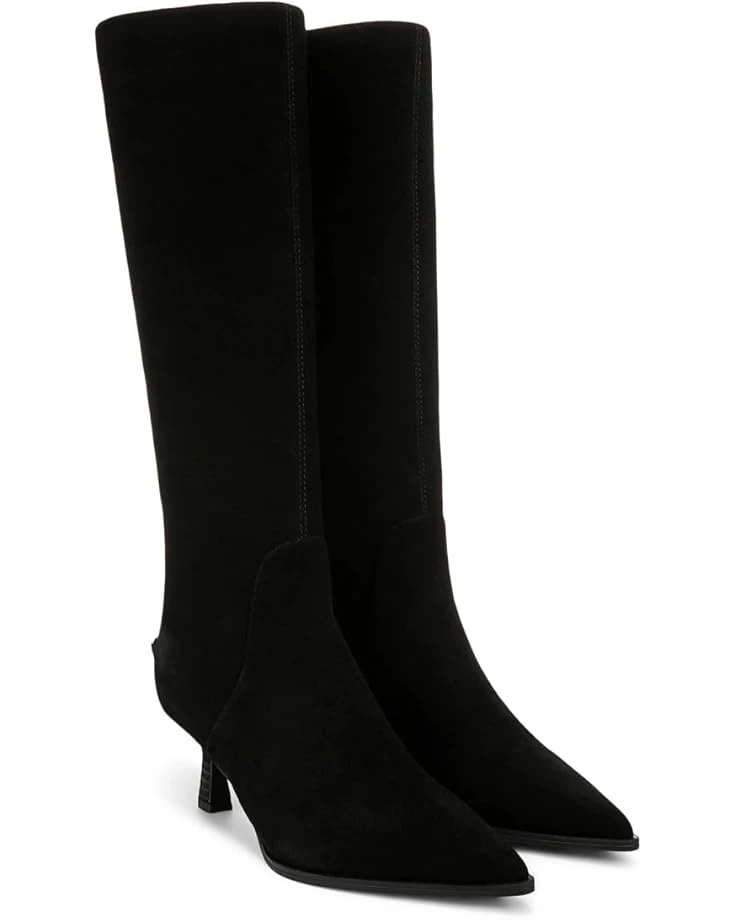 I didn’t expect to like these boots as much as I do! They super comfortable are my usual size in Sam Edelman boots. The full zip makes them much easier to get on and off and the kitten heel is just tall enough to elongate your legs but short enough to be practical to walk in. The brown suede is also a true chocolate/espresso brown – it is not lighter in person. I personally love the pointed toe because it makes the boot look more sophisticated, but it does mean there’s an extra 1/2-1″ in the toe box so if you have big feet you may not like that. I have small feet and these definitely made my feet look bigger but I don’t mind it.