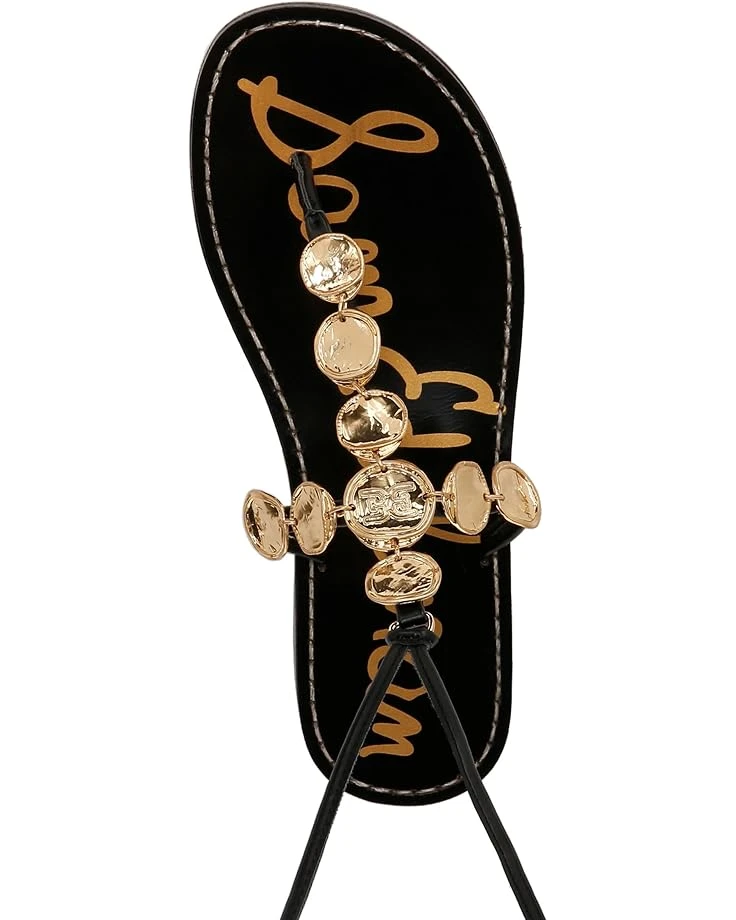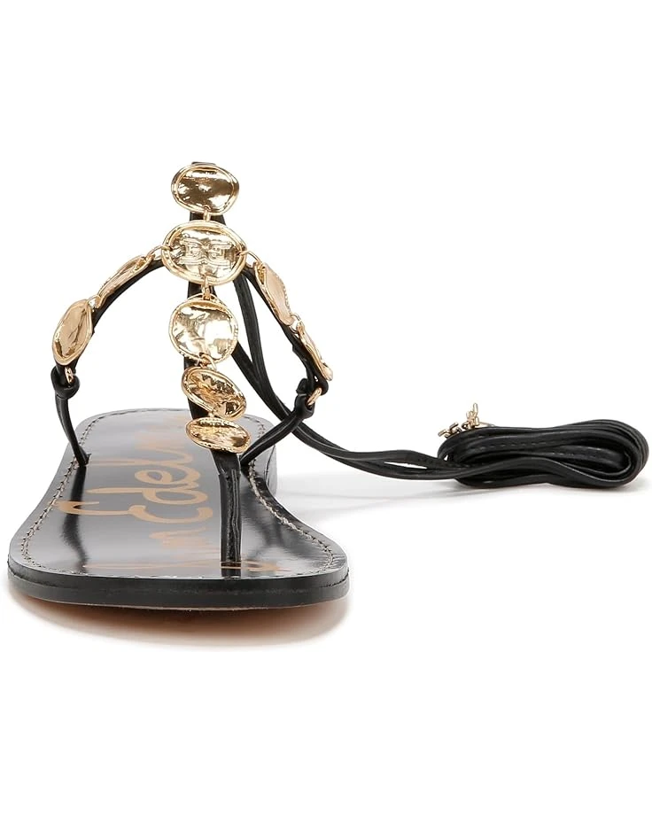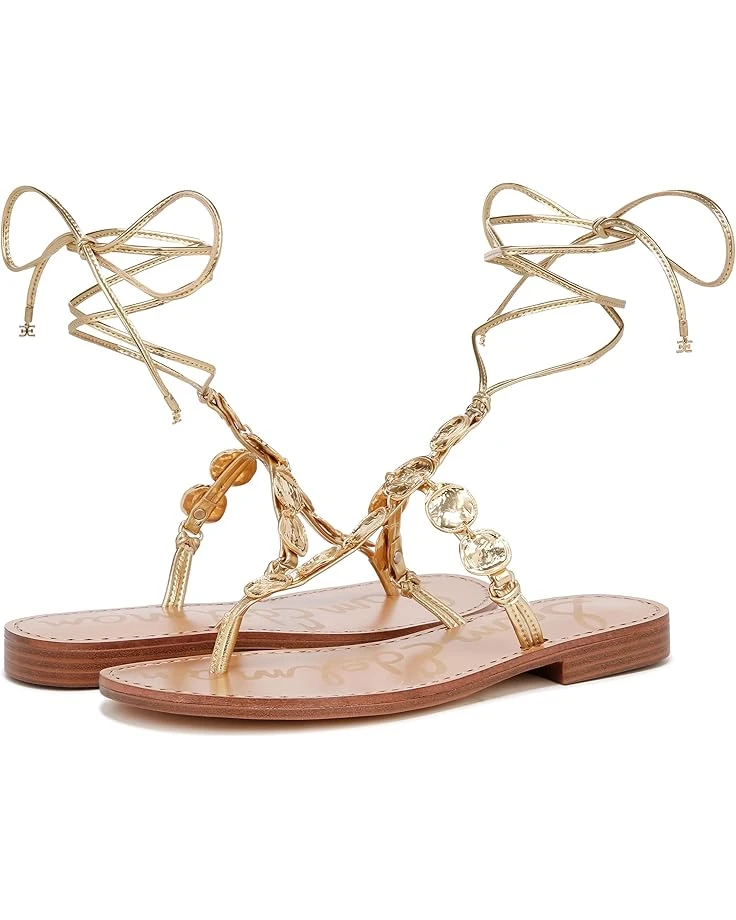 - Step into summer elegance with Sam Edelman® Deirdre sandals. These sandals feature a T-strap upper adorned with delicate coin details and logo charms, adding a touch of bohemian charm to your look. The ankle-wrap design with tie closure not only adds a stylish flair but also provides a customizable fit for all-day comfort.