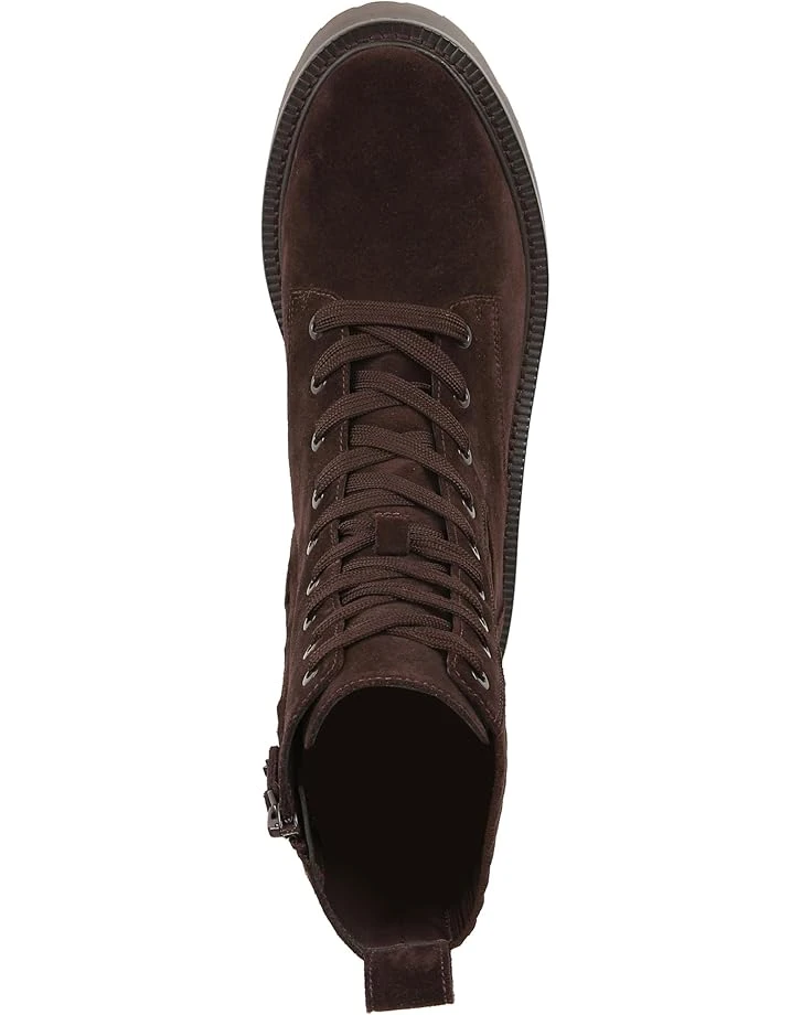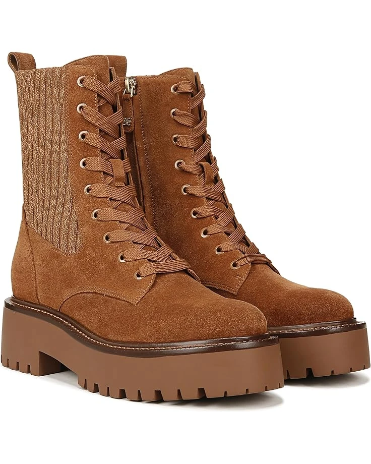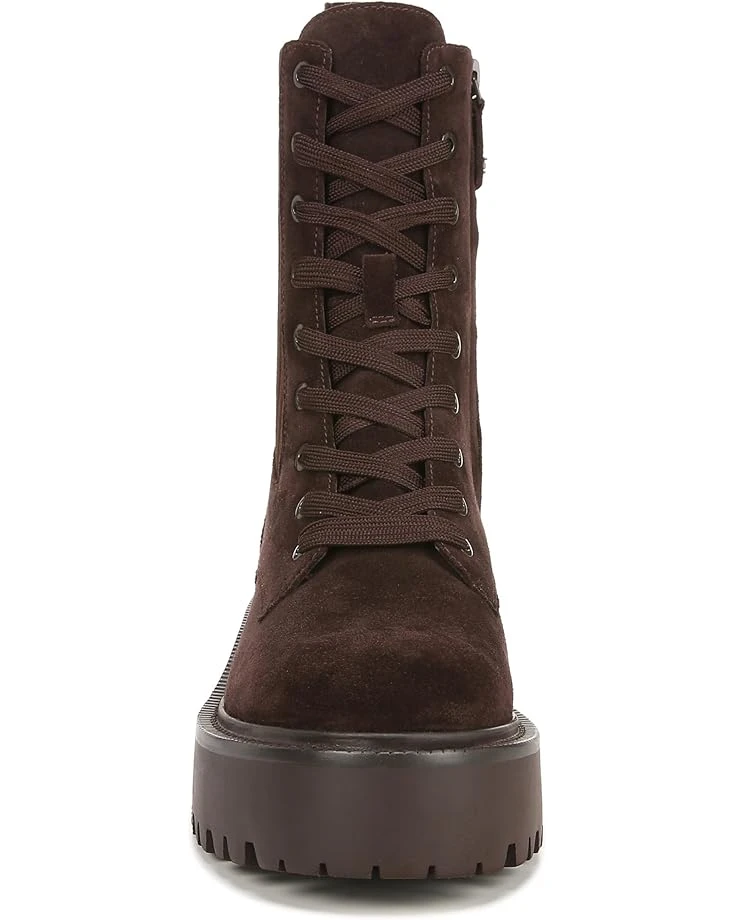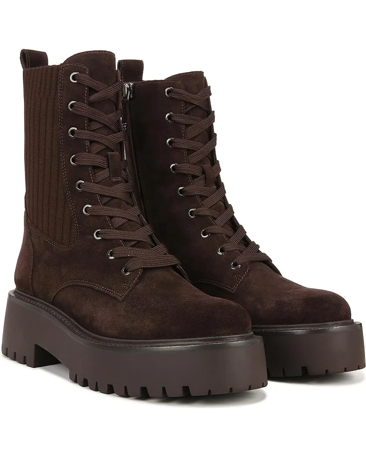 I have the dark brown color in 8.5, and they are comfortable right out of the box. I generally do not wear socks, but there’d be room for that. The lacing and zipper combo make these fairly adjustable. The entire boot from sole to laces, to grommets, sock edging, suede and stitching is uniform in color. FYI – the picture looks less uniform because of the lighting and contrasts. I do like the uniformity as it balances out the edgy design, meaning you can get away with wearing these anywhere anytime – if that makes any sense – and can wear these with any combination of colors and there would be no clash. I like that these boots are no-brainers, I can without pause reach for these instead of contemplating if they are going to be appropriate or not or match what I’m wearing. The slight platform is perfect for fall, winter and the ensuing mud puddles. For suede it’s good to have a little buffer brush. I prefer suede because of its soft look and feel and these boots with the sock siding hit all the marks with coziness.