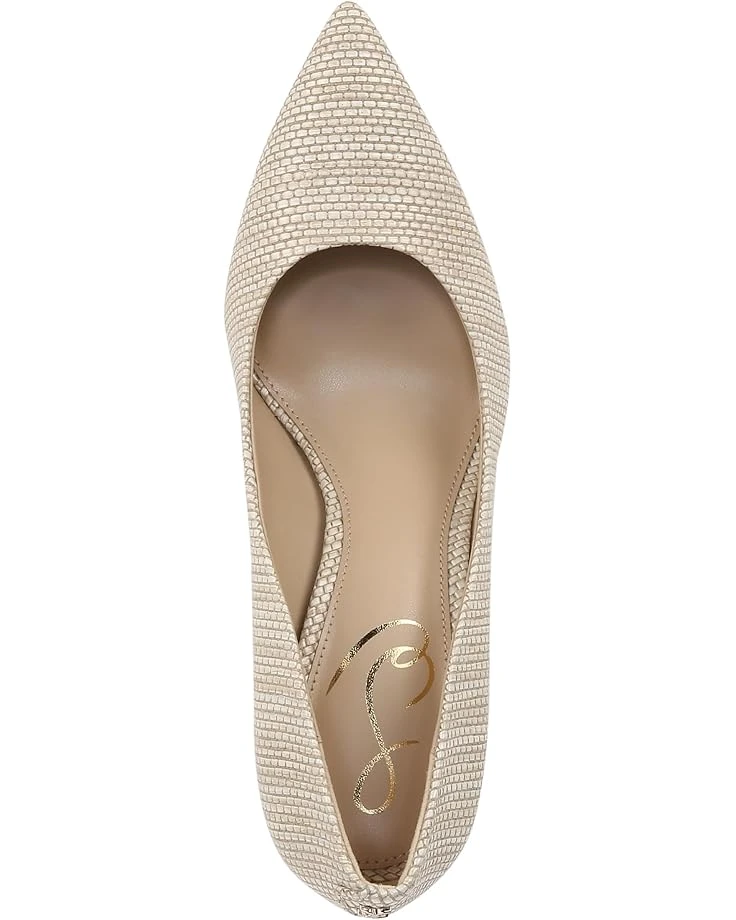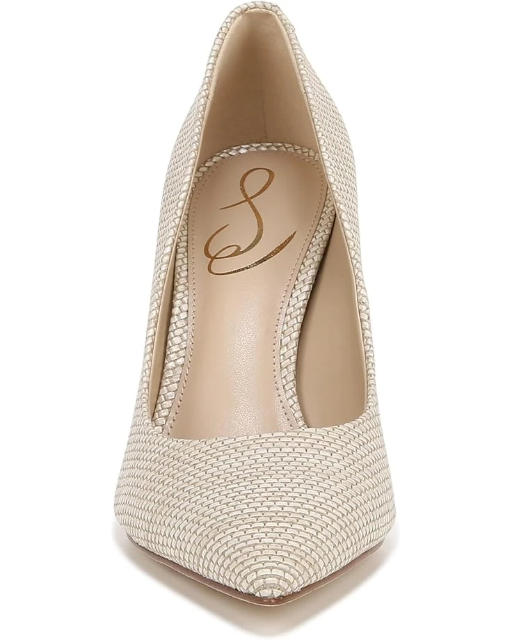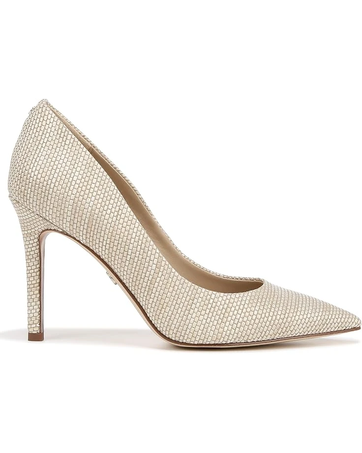 - Step up in style and elegance by wearing the Sam Edelmanยฎ Hazel heels. The slip-on style pumps have a closed pointy toe design with sleek stilettos heels and intricate design on the fabric upper. The heels features a synthetic lining and polyurethane footbed for longevity and comfortable prolonged wear.