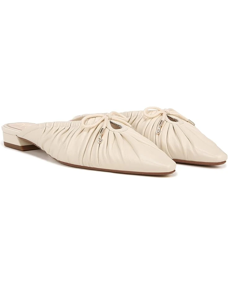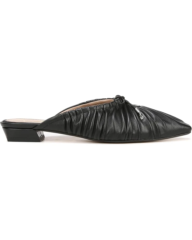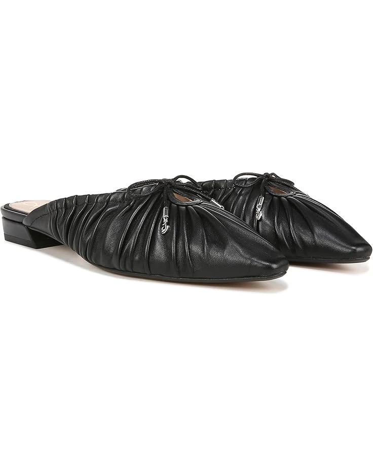 - Match your maxi dress or flowing gowns for a stunning look by wearing Sam Edelman® Julia footwear. It is crafted from leather upper, synthetic lining, and polyurethane footbed. A pointy toe with gathered details and front loop fastening adds to the stylish look of the footwear. It has slide-on style and low block heel, making it comfortable for walk.