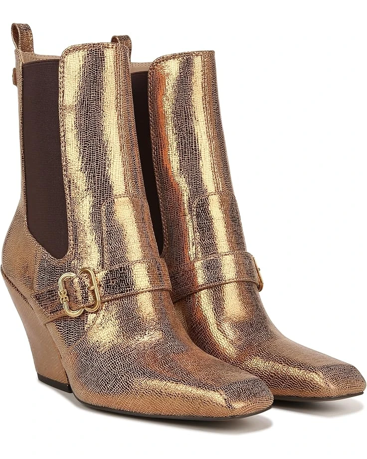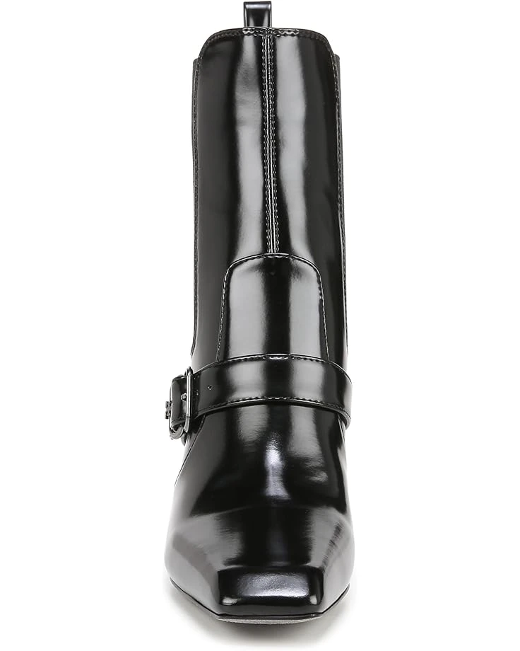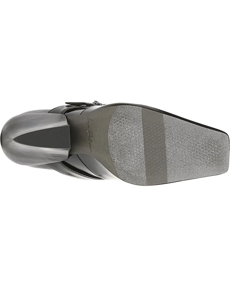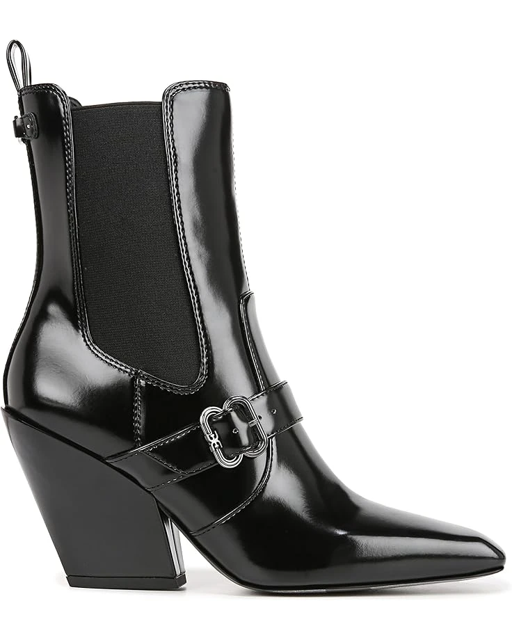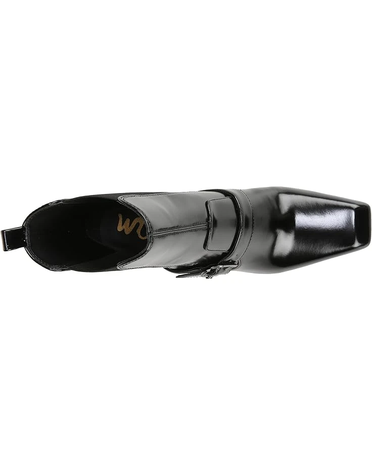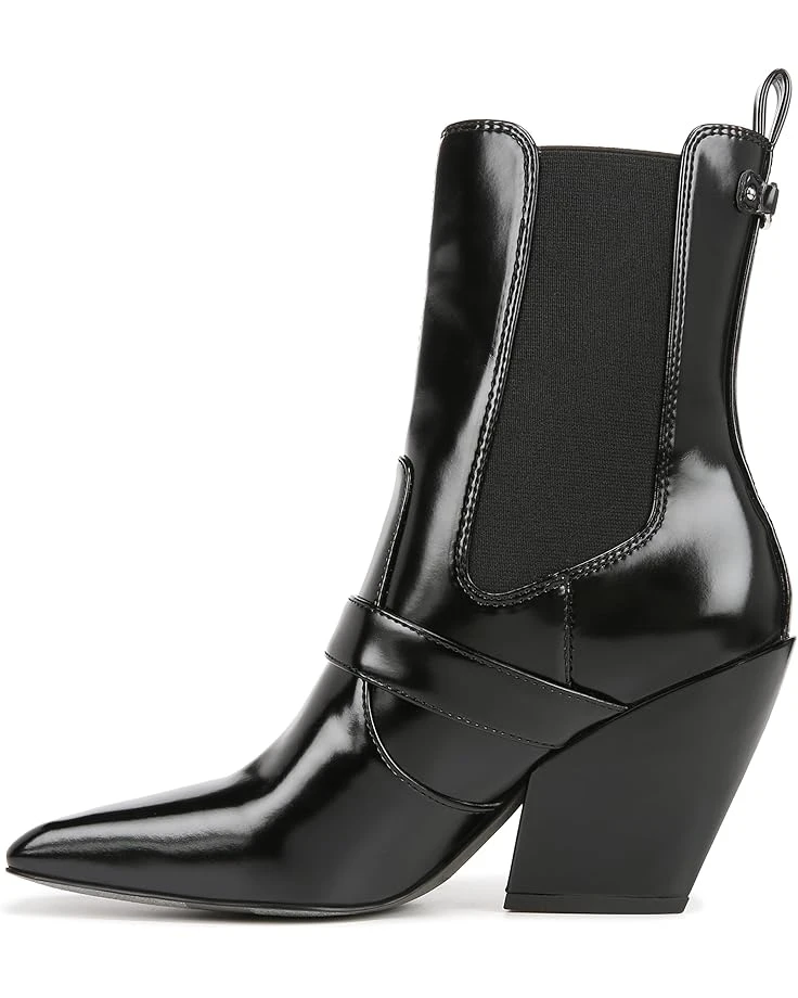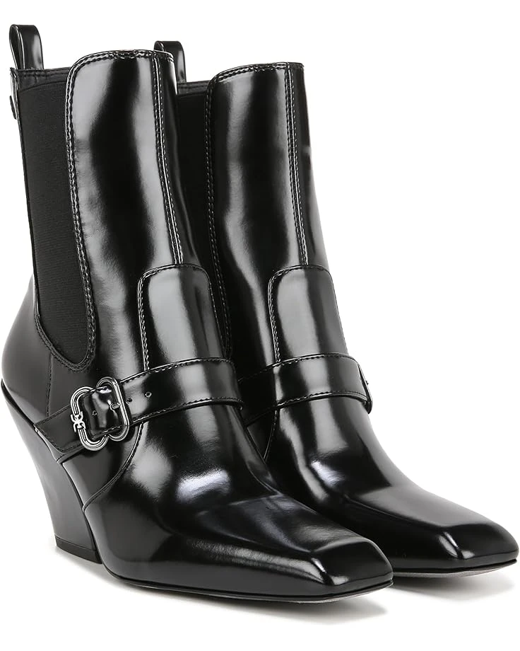 - Bring elegance to your look by stepping out wearing the Sam Edelman® Suzette heels. Fashioned with a glossy leather upper, these chelsea boots will effortlessly make their way in your closet with their angular, square toe design, combined with charming flared heel. Their pull-on silhouette can be easily adjusted with the buckle detail at the ankle and is accompanied by elasticized side panels and pull tabs.