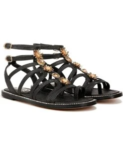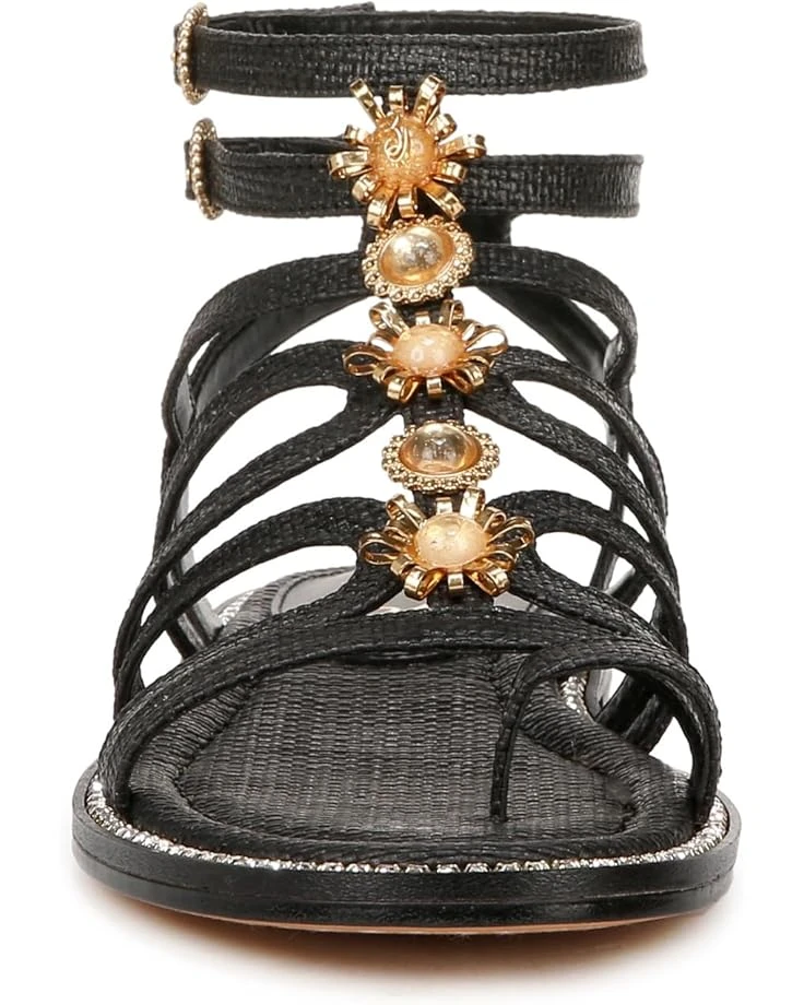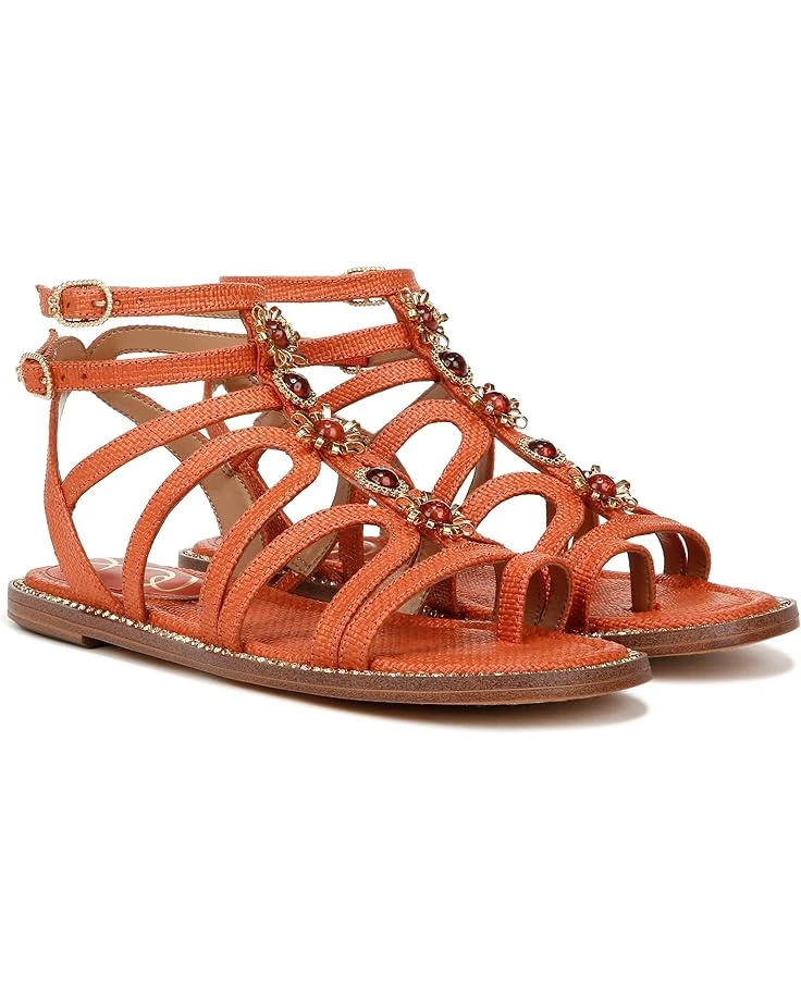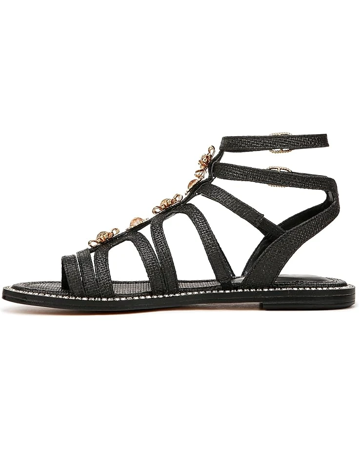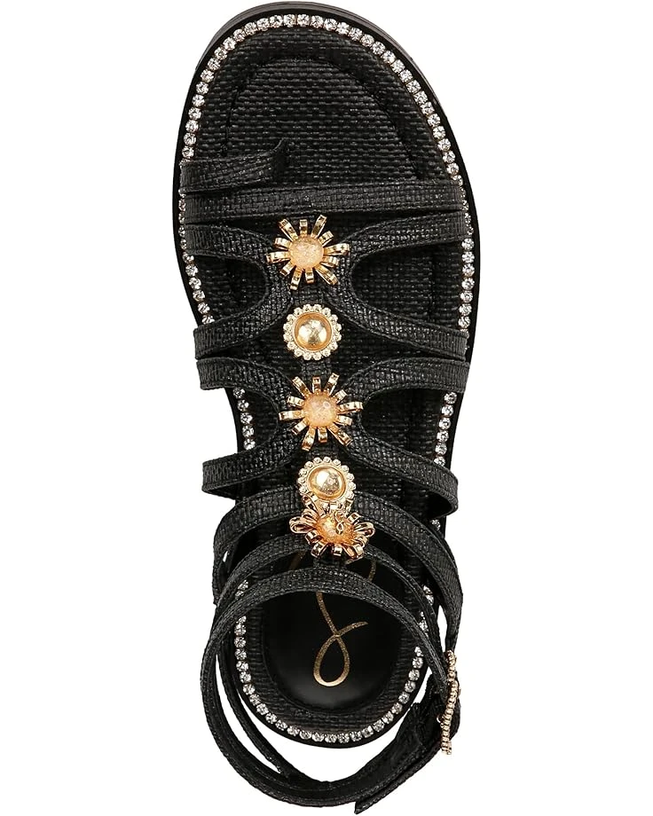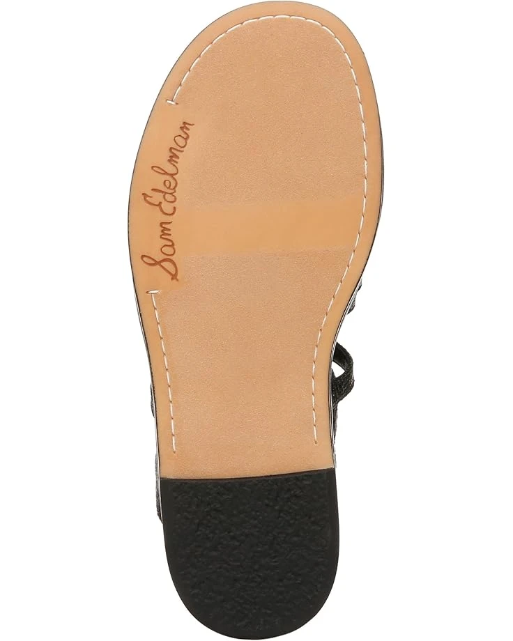 - Go beyond basic with the sleek and incredibly chic Sam Edelman® Tianna Flat Sandals! Visualizing a gladiator-style strappy design with striking crystal accents, the shoes possess a PU upper, a fabric lining, and a lightly padded PU footbed. The stretch goring on the straps offer an easy, flexible fit while the adjustable buckled closures keep your feet perfectly secure.